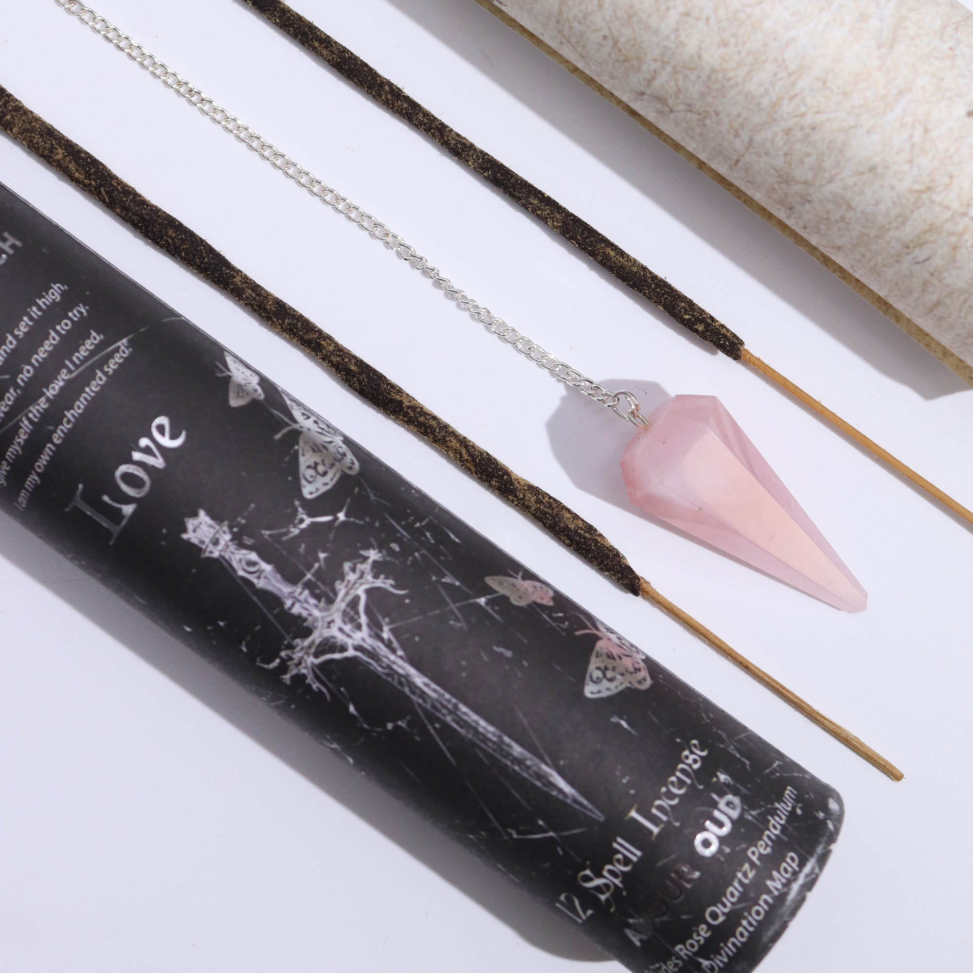 Das Liebe Zauber Räucherstäbchen ist eine warme und einladende Wahl für Einzelhändler, die ein zugängliches Produkt mit emotionaler Ausstrahlung anbieten möchten. Jedes Röhrchen enthält etwa zwölf Räucherstäbchen, ein Rose Quartz-Pendel und eine Wahrsagekarte, alles präsentiert in hochwertiger Verpackung, die bereits beim Aufnehmen einen besonderen Eindruck vermittelt. Rose Quartz wird weithin als Edelstein betrachtet, der mit Mitgefühl,