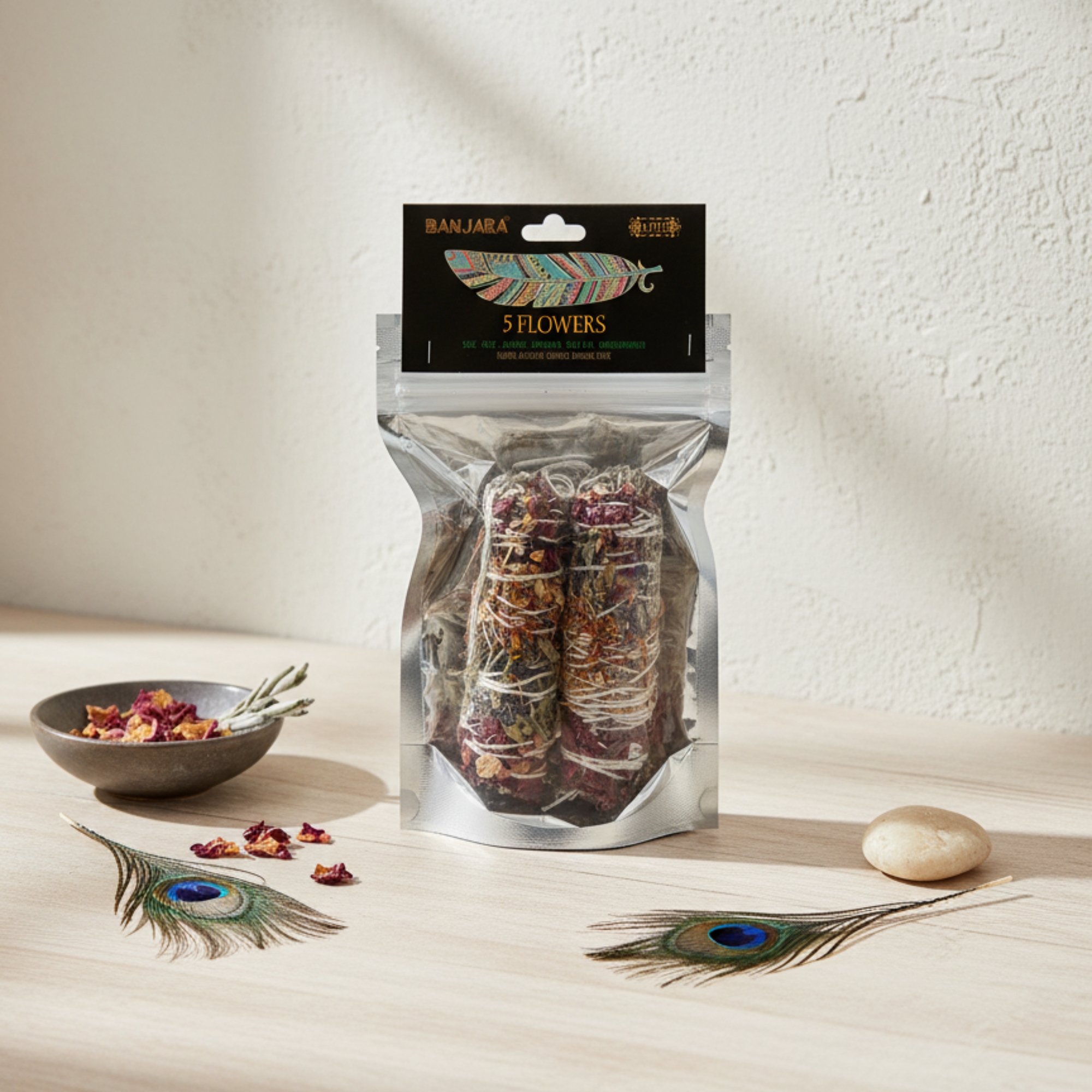 Erwecke die Sinne mit den Banjara Räucher-Bündeln – 5 Blumen, einer strahlenden Mischung aus Himalaya-Salbei und den heiligen Blüten von Rose, Jasmin, Ringelblume, Schmetterlingserbse und Rhododendron.
