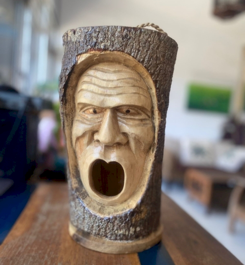 Die auf Bali handgefertigten Vogelhäuser aus Baumstamm – „Mürrischer Alter“ sind einzigartige Kunsthandwerksstücke, direkt aus natürlichem Holz geschnitzt. Ihr rustikales Design fällt durch das Gesicht eines griesgrämigen alten Mannes auf, voller Ausdruck und Persönlichkeit. Es verleiht jedem Außenbereich einen humorvollen, geheimnisvollen und leicht frechen Akzent.