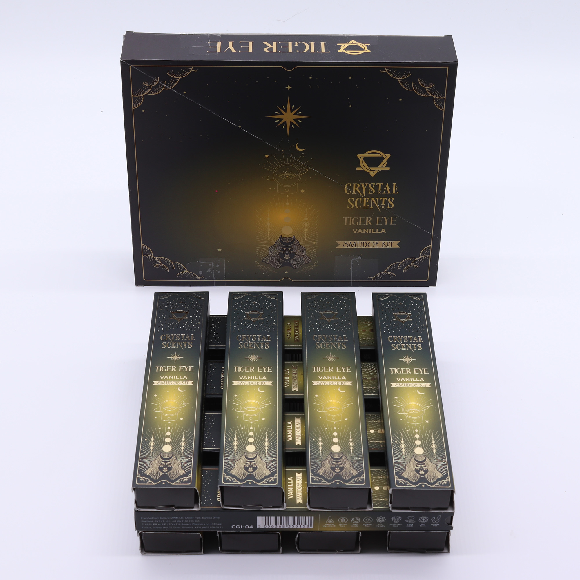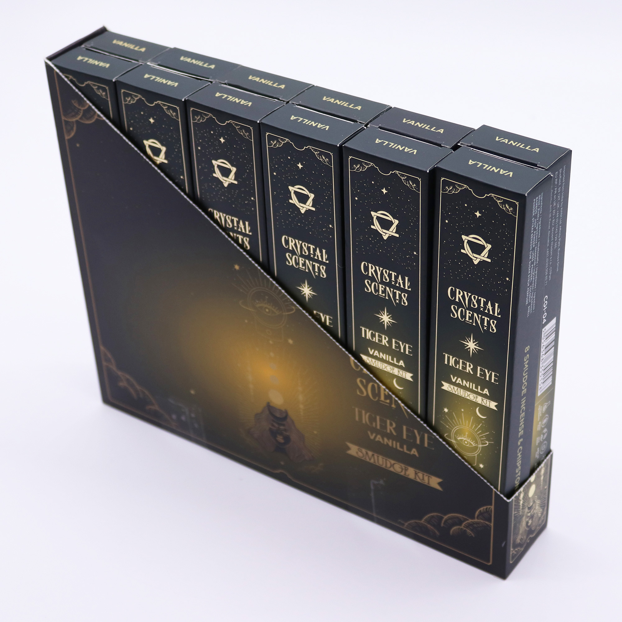 Jede Packung enthält 10 handgefertigte Räucherstäbchen und einen echten Tigerauge-Kristall, wodurch das Produkt ideal für Händler ist, die Wohlfühlartikel, spirituelle Geschenke oder Tools für Intentionsarbeit anbieten. Die Kombination eignet sich sowohl für stille Alltagsrituale als auch für strukturierte Manifestationspraktiken.