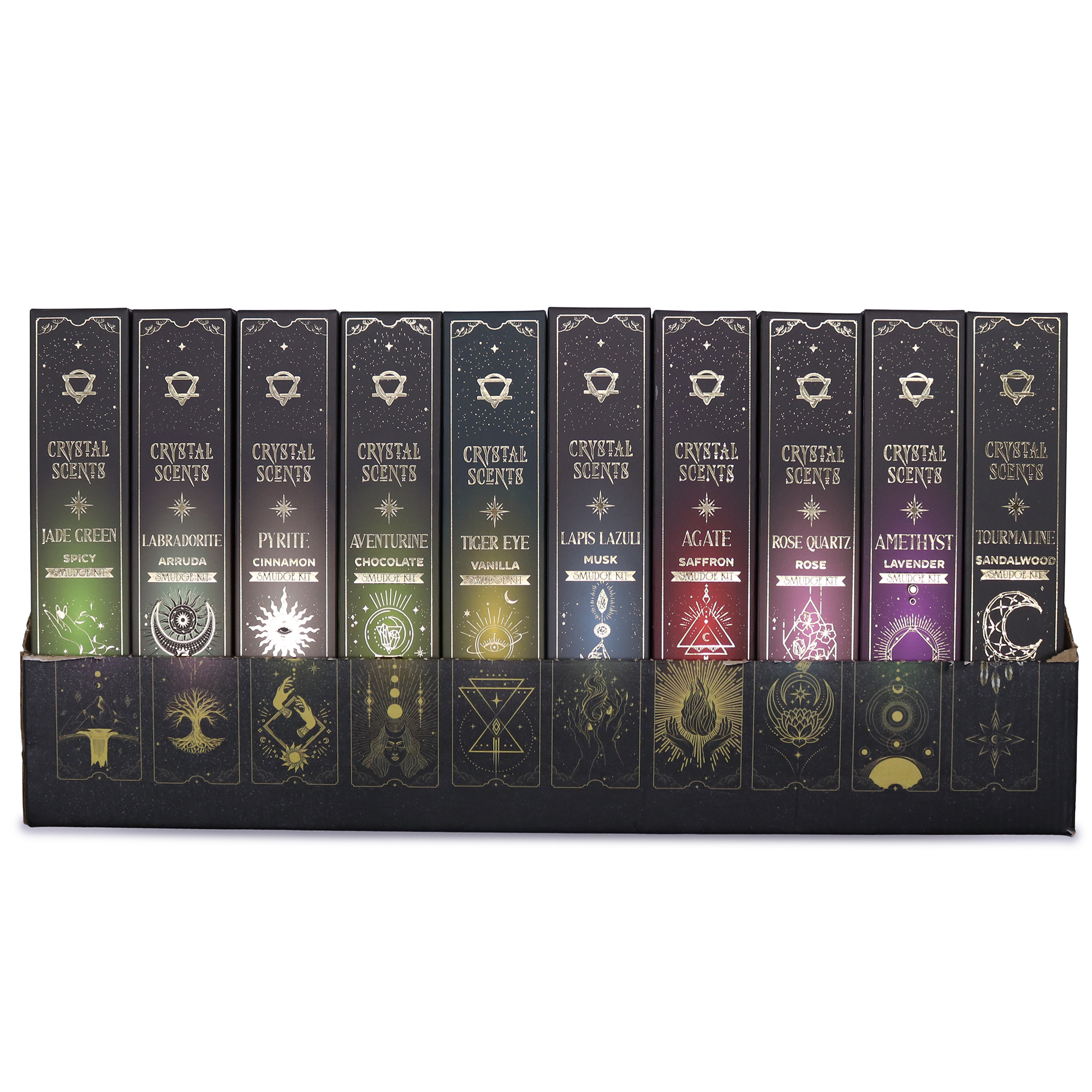 Ein komplettes, vielseitiges Set – perfekt, um Kund:innen die volle Kraft und Vielfalt der Crystal Scents Räucherstäbchen-Kollektion vorzustellen.