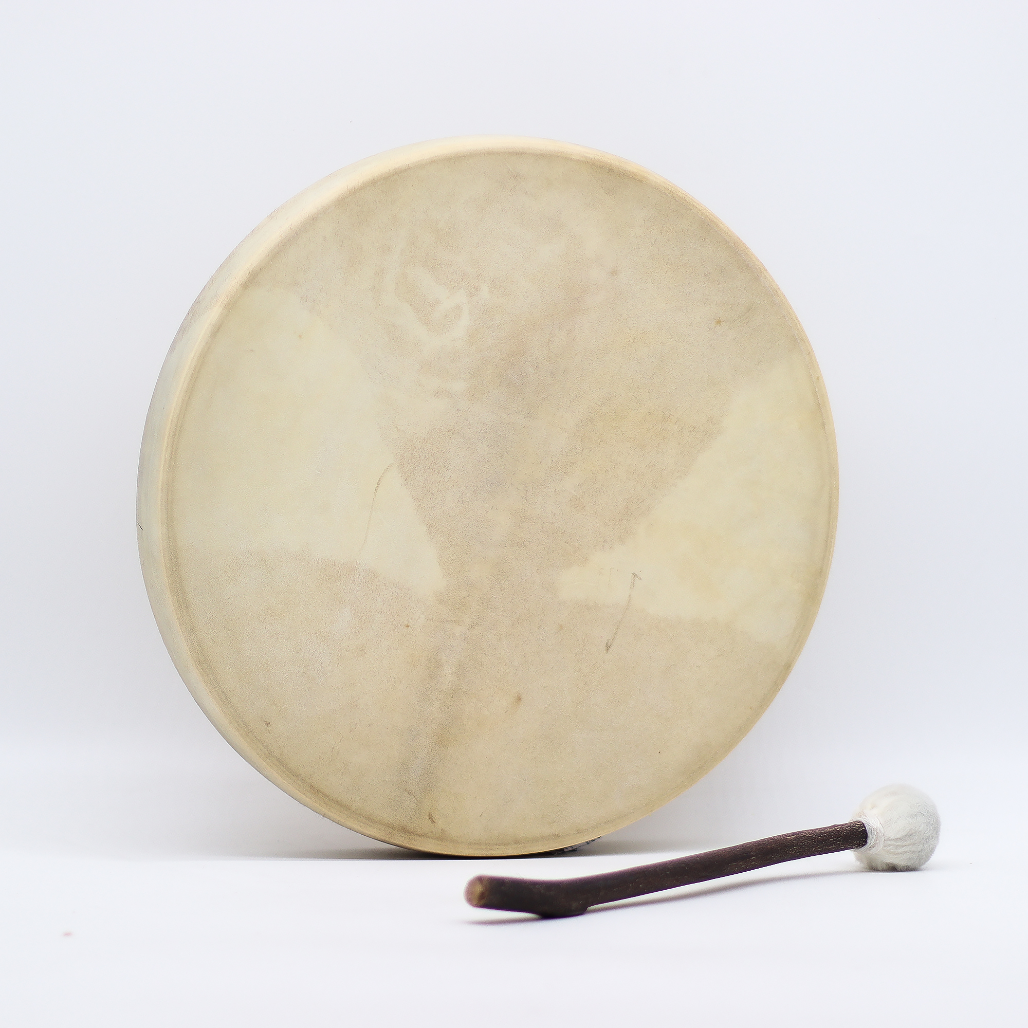 Was diese Trommel so besonders macht, ist der kunstvoll handgeschnitzte Drachenkopfgriff auf der Rückseite. Der Drache, ein zeitloses Symbol für Transformation, Stärke und spirituelle Kraft, verleiht ihr eine beeindruckende visuelle Wirkung und tiefe Bedeutung. Diese detailreiche Schnitzerei macht die Trommel von einem Musikinstrument zu einem hochwertigen Schmuckstück, das Musiker, spirituell Praktizierende und Sammler gleichermaßen begeistert.