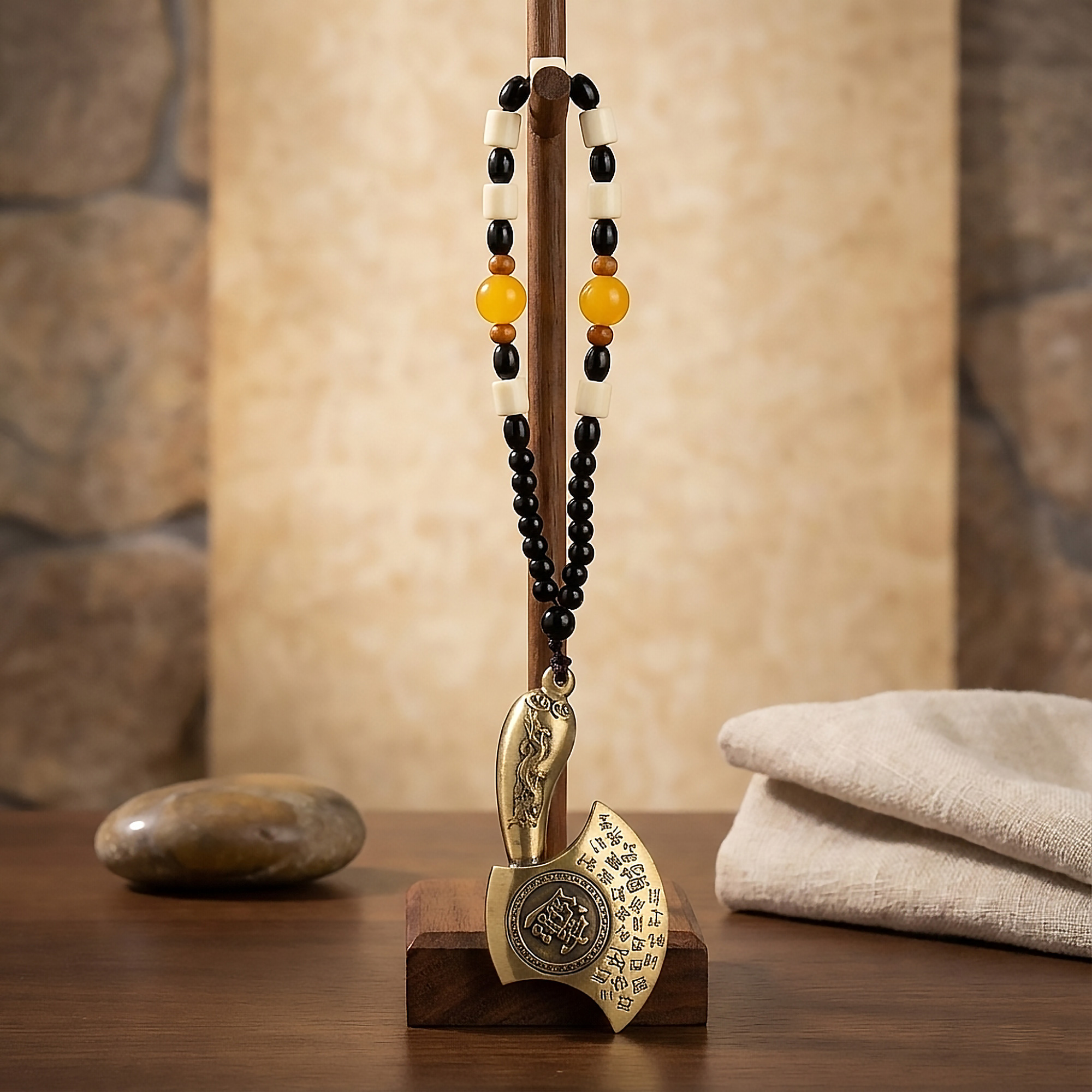Dieser Feng-Shui-Hänge-Axt basiert auf einer traditionellen Zeremonialaxt und symbolisiert Autorität, Schutz und die Bewahrung von Wohlstand. In der Feng-Shui-Praxis stehen Axtmotive für Kontrolle über Ressourcen und die Sicherung von Prosperität – nicht für Gewalt oder Konflikt. Das Stück verbindet symbolische Bedeutung mit dekorativer Wirkung und eignet sich sowohl für spirituelle Räume als auch für interieurorientierte Bereiche.