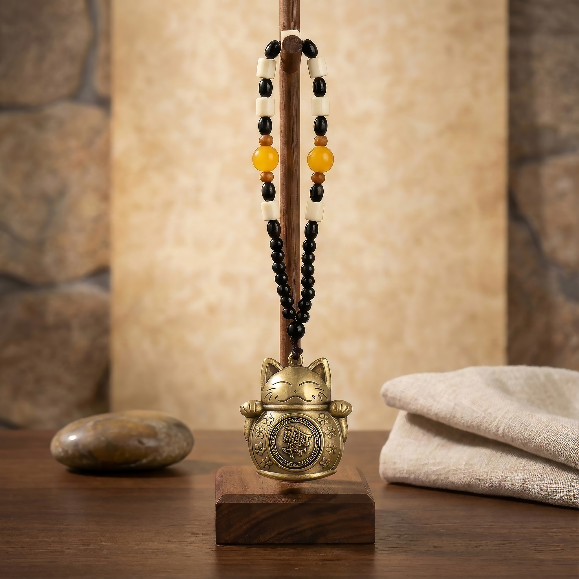 Aufgehängt an einer dekorativen Perlenkordel aus schwarzen, cremefarbenen, bernsteinfarbenen und hölzernen Perlen, bietet dieses Stück einen ausgewogenen visuellen Kontrast und eine harmonische Feng-Shui-Farbgebung. Es lässt sich problemlos in der Nähe von Eingängen, Kassen, auf Schreibtischen, Regalen oder in Wohlstandsbereichen im Zuhause oder am Arbeitsplatz anbringen, wo es traditionell dazu dient, Wohlstand willkommen zu heißen und finanzielle Energie zu schützen.