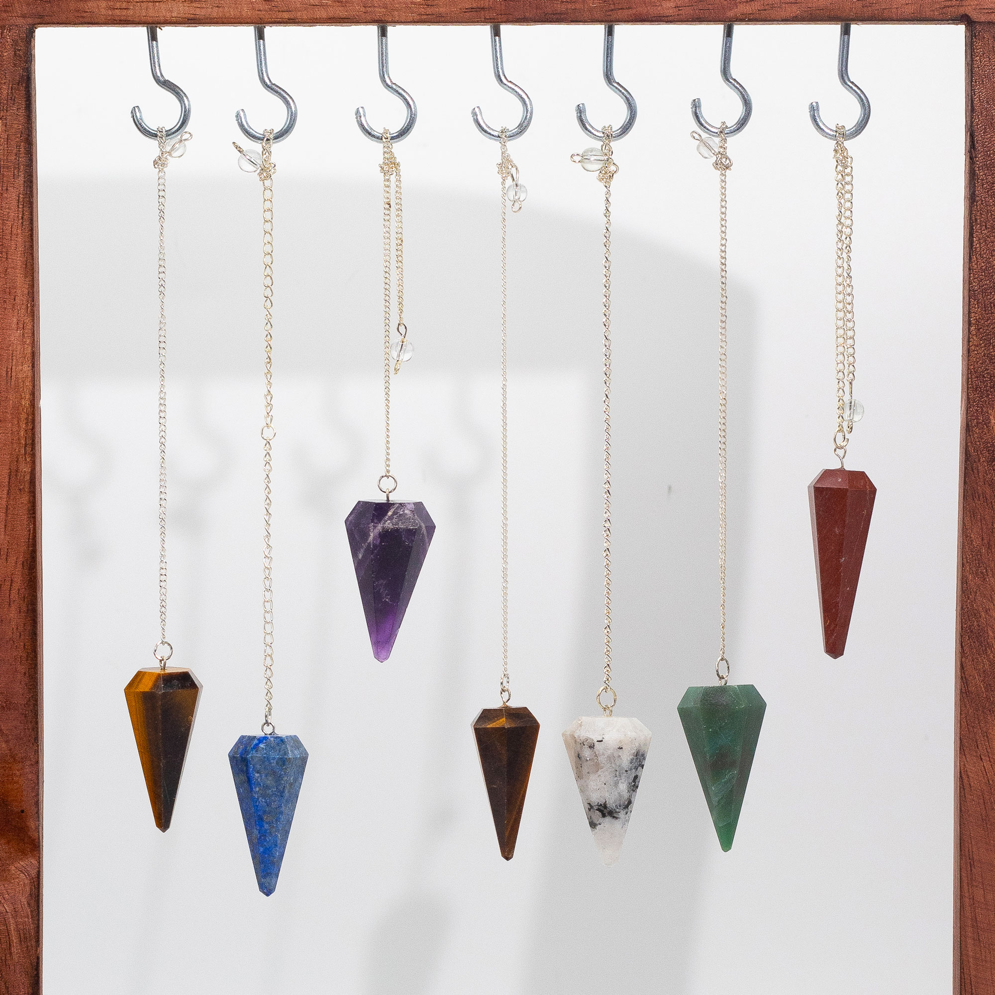 Dieses wunderschön zusammengestellte Edelsteinpendel-Starterpaket enthält 30 handgefertigte Pendel, die von erfahrenen Kunsthandwerkern in Indien gefertigt wurden.
