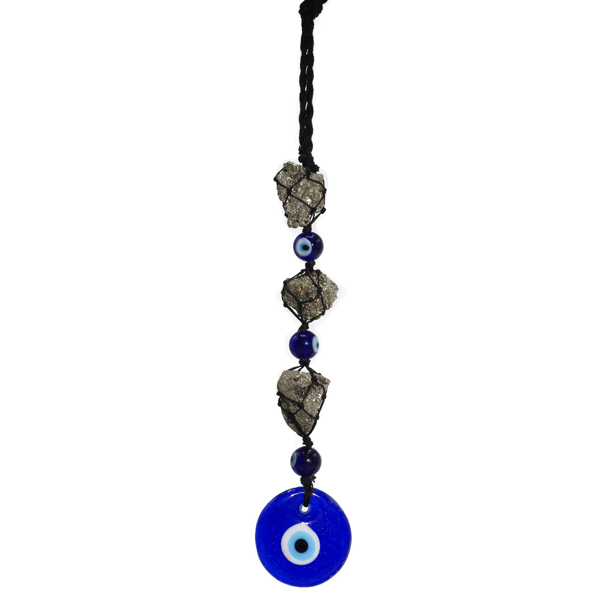 Präsentieren Sie Ihren Kunden ein Produkt, das modernes Design und spirituelle Symbolik auf wunderschöne Weise vereint: den Hängenden Steinanhänger mit Pyritsteinen und Perlen, verziert mit dem Symbol des Bösen Blicks.
