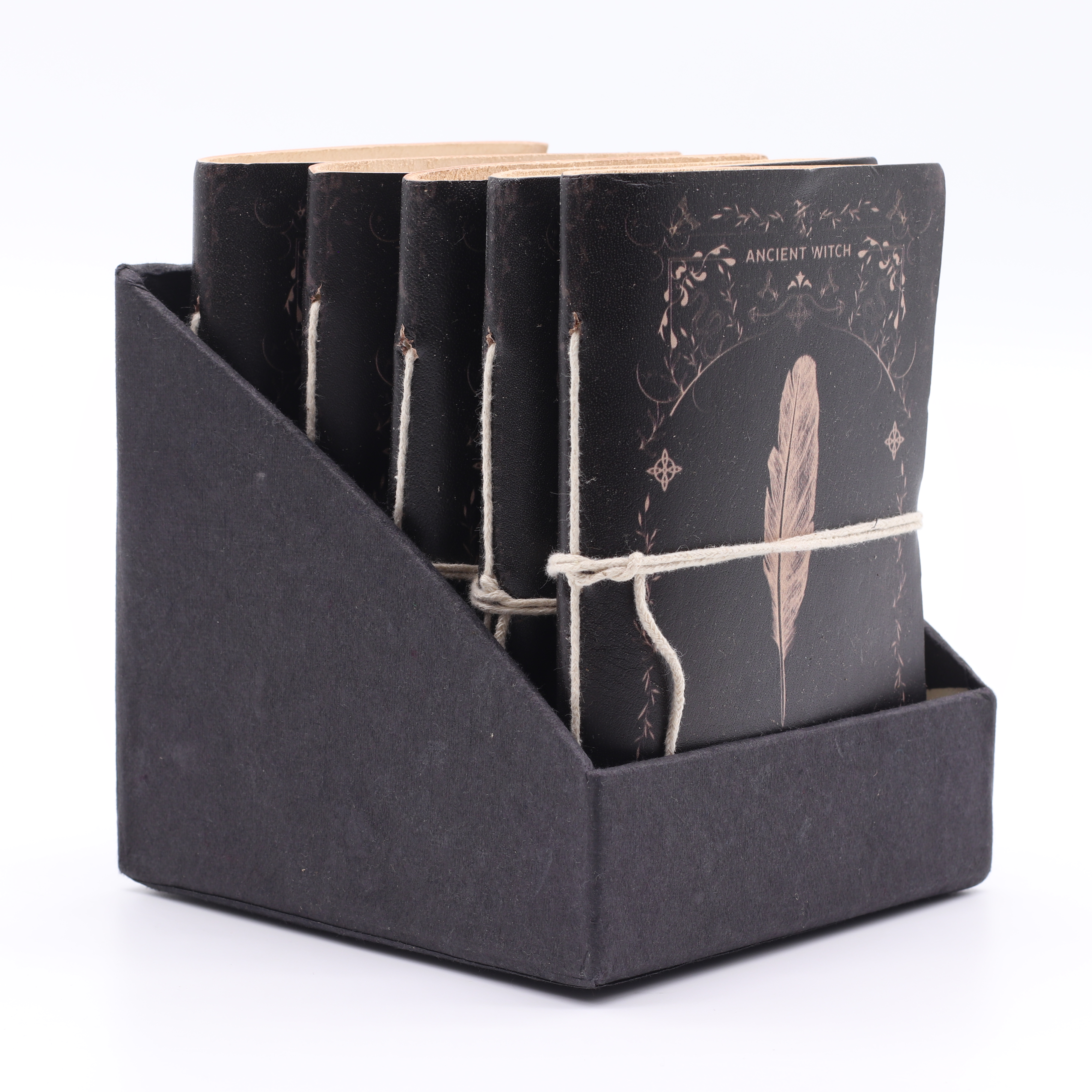 Jedes Notizbuch ist ein Zeugnis echter Handwerkskunst – vom geprägten Einband bis zur sorgfältig handgebundenen Rückenpartie. Präsentiert in einer ansprechenden Displaybox bietet dieses 5er-Set sowohl visuelle Wirkung als auch praktischen Verkaufswert für Händler, die authentische, bedeutungsvolle Produkte mit mystischer Ausstrahlung suchen.