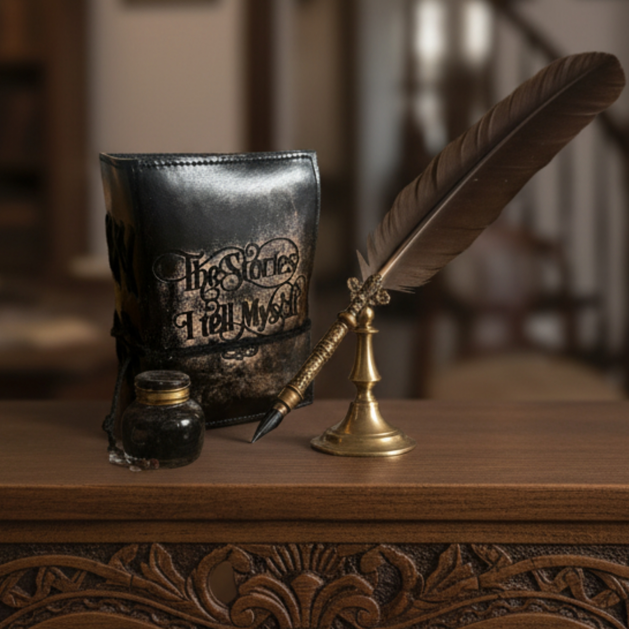 Der Einband trägt die nachdenkliche Gravur “The Stories I Tell Myself.” – ein schlichtes, aber tiefgründiges Zitat, das auf die inneren Erzählungen anspielt, die wir in uns tragen. Es erinnert uns daran, dass unser innerer Dialog formt, wie wir die Welt wahrnehmen – und lädt zu Selbstreflexion, Achtsamkeit und kreativer Ehrlichkeit ein.