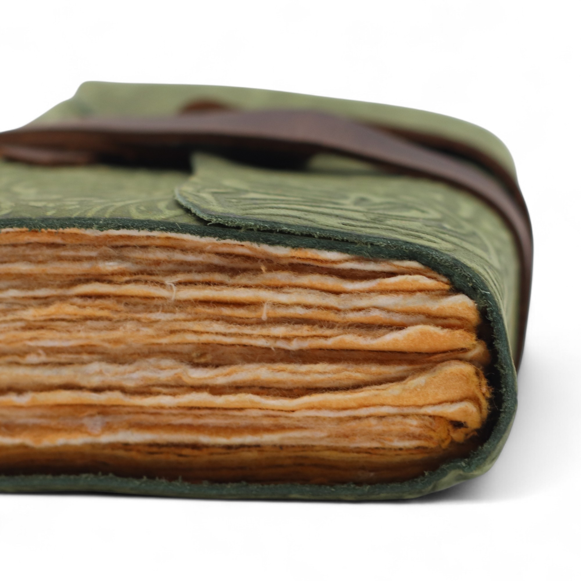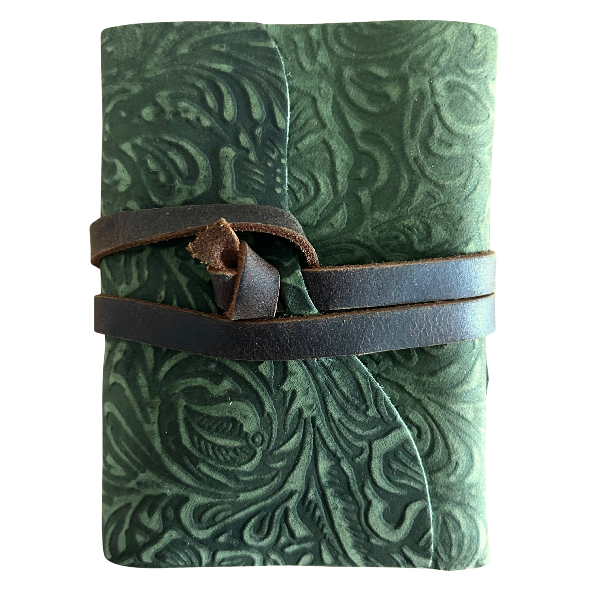Mit den Maßen 12,7 × 8,9 cm ist dieses kompakte, aber gewichtige Notizbuch aus echtem Leder handgefertigt, in ein tiefes, erdiges Grün gefärbt und mit einem filigranen Labyrinthmuster geprägt – einem Symbol für Entdeckung, Fokus und innere Erkundung.