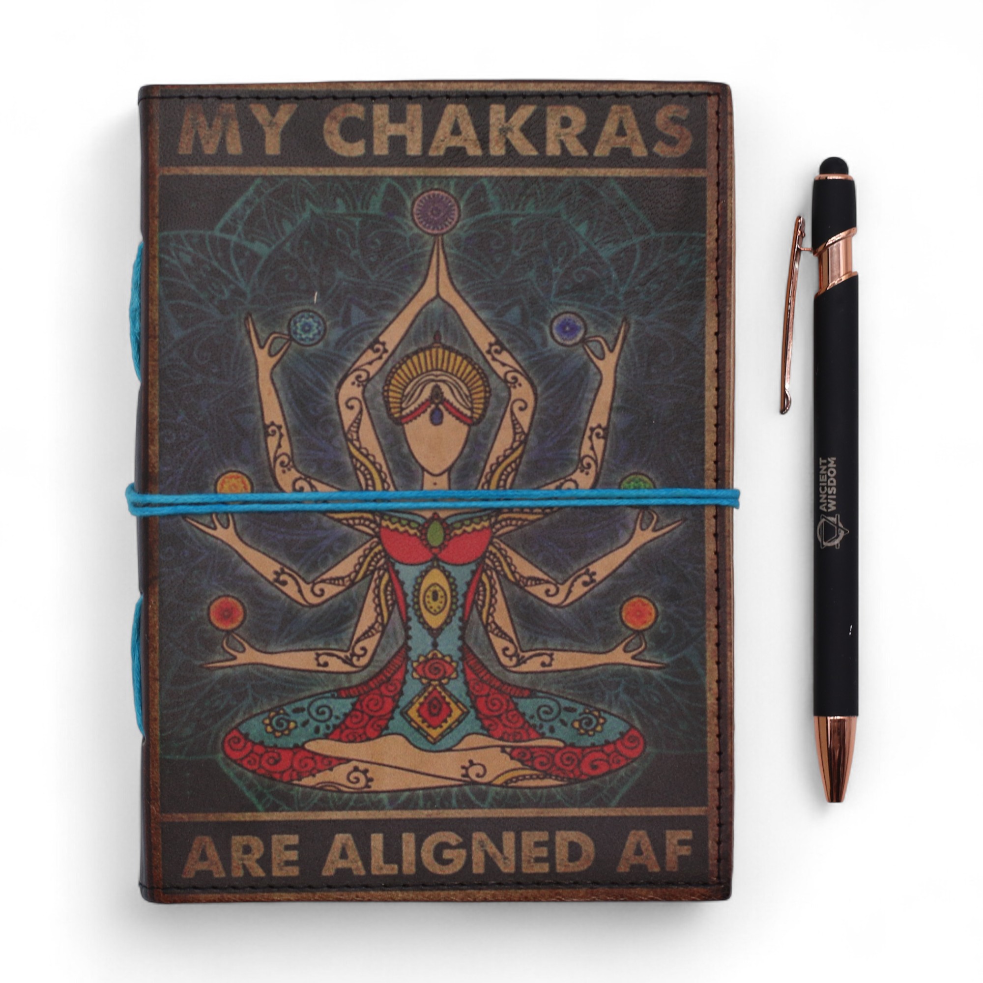 Mit den Maßen 17,8 × 12,7 cm ist dieses Notizbuch handgefertigt aus echtem Leder und verfügt über eine glatte Oberfläche, bedruckt mit der bestärkenden Affirmation „My Chakras Are Aligned AF“.