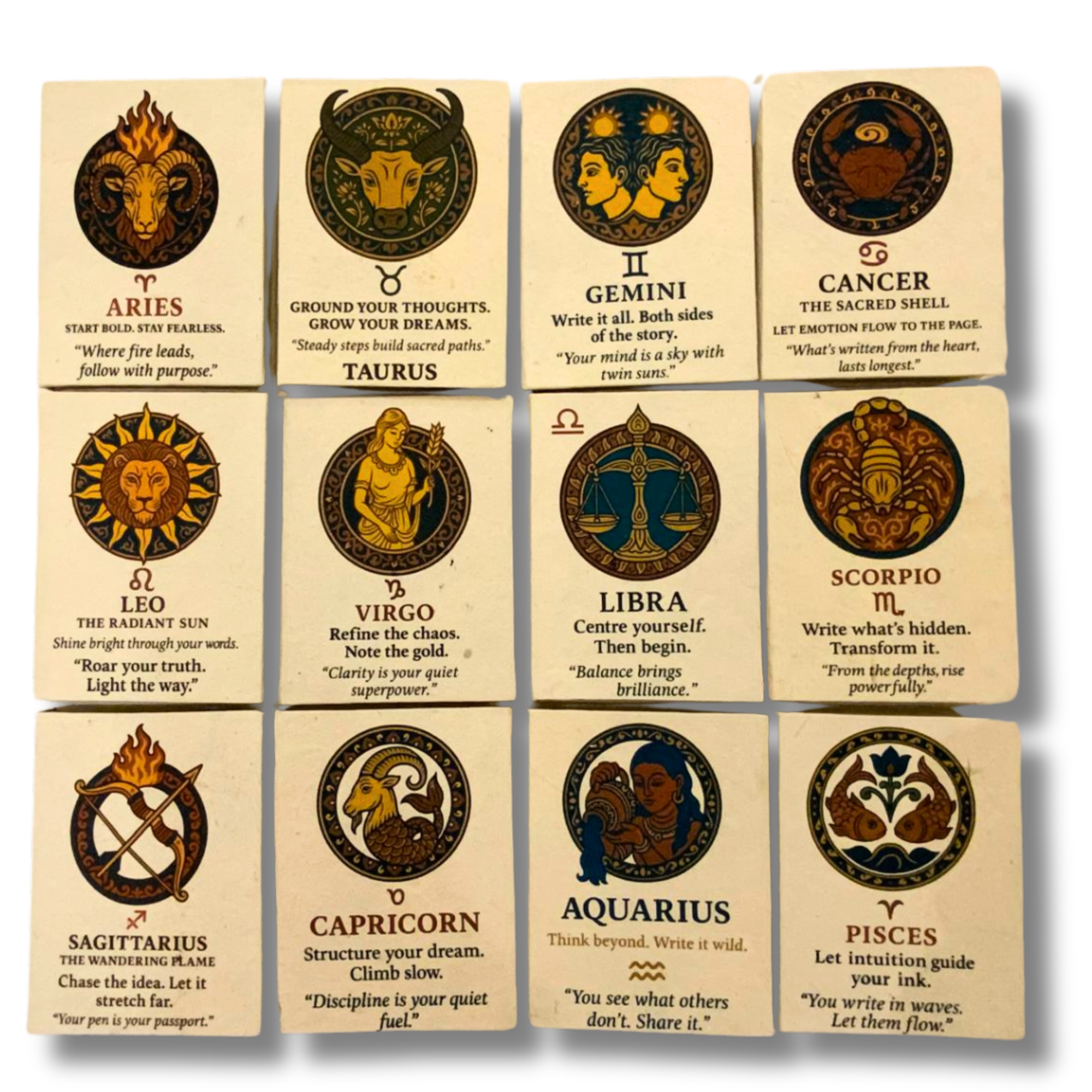 Dieses Set umfasst 12 einzigartige Cover-Designs, die jeweils einem Tierkreiszeichen gewidmet sind: Widder, Stier, Zwillinge, Krebs, Löwe, Jungfrau, Waage, Skorpion, Schütze, Steinbock, Wassermann und Fische.