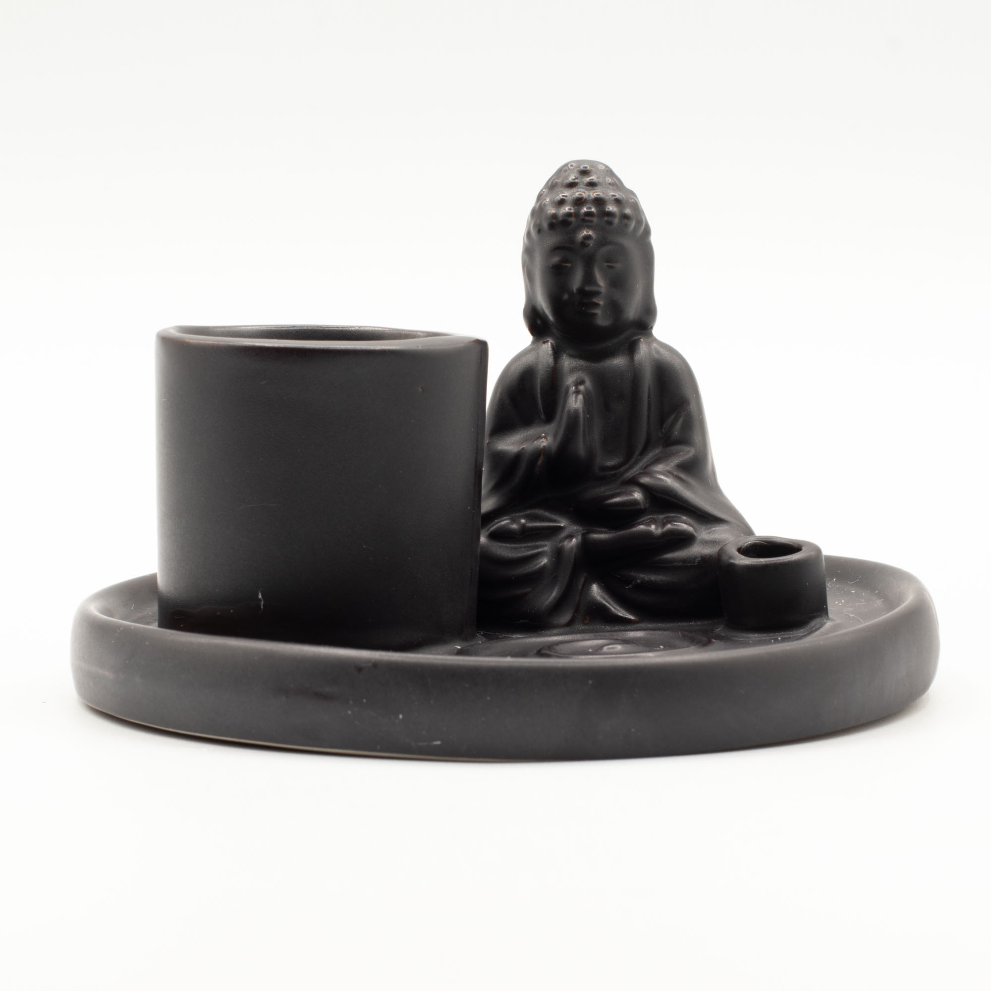 Das Design zeigt einen ruhigen sitzenden Buddha auf einer runden Platte mit integrierten Haltern für Räucherstäbchen und Kegel. Die matte schwarze Keramikoberfläche verleiht eine zeitgemäße Ausstrahlung, während Form und Symbolik im Mittelpunkt stehen. Praktisch für den täglichen Gebrauch, hält die Platte die Asche sauber und fungiert gleichzeitig als dezenter dekorativer Akzent.