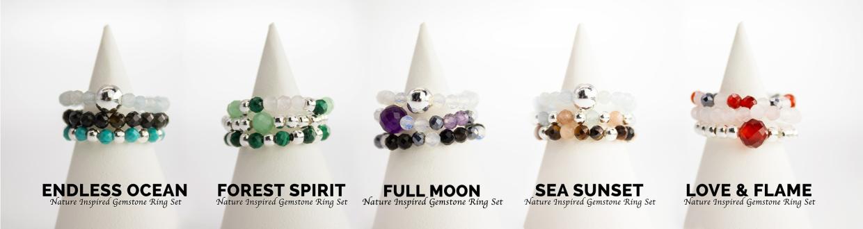 Die Nymph Edelsteinring-Set Kollektion besteht aus aufeinander abgestimmten Sets mit jeweils drei elastischen Ringen, gefertigt aus echten Edelsteinen und silberfarben beschichteten Perlen. Die Ringe können einzeln oder kombiniert getragen werden und bieten vielseitige Styling-Möglichkeiten, während sie gleichzeitig ein harmonisches und wiedererkennbares Gesamtbild der Kollektion bewahren.