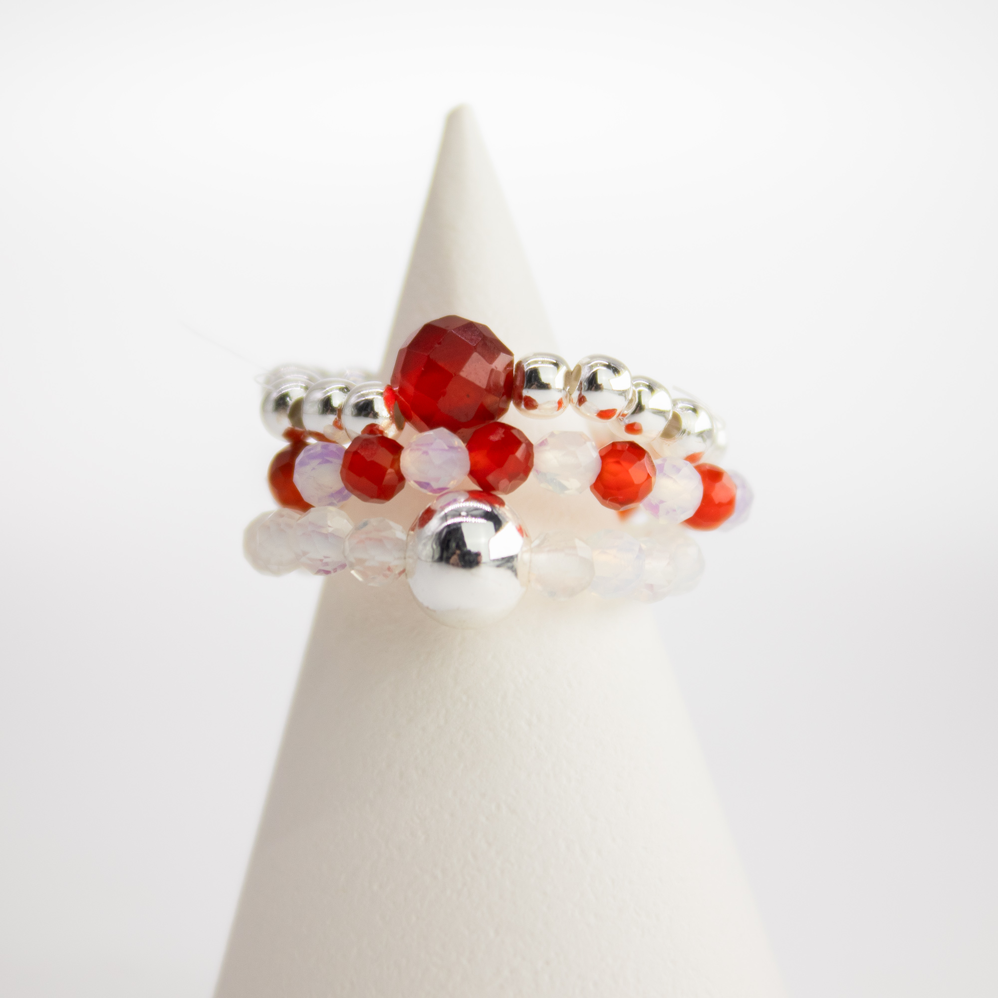 Elastische Ringe, passend für die meisten Fingergrößen. Echte Edelsteine. Silberfarben beschichtete Perlen.