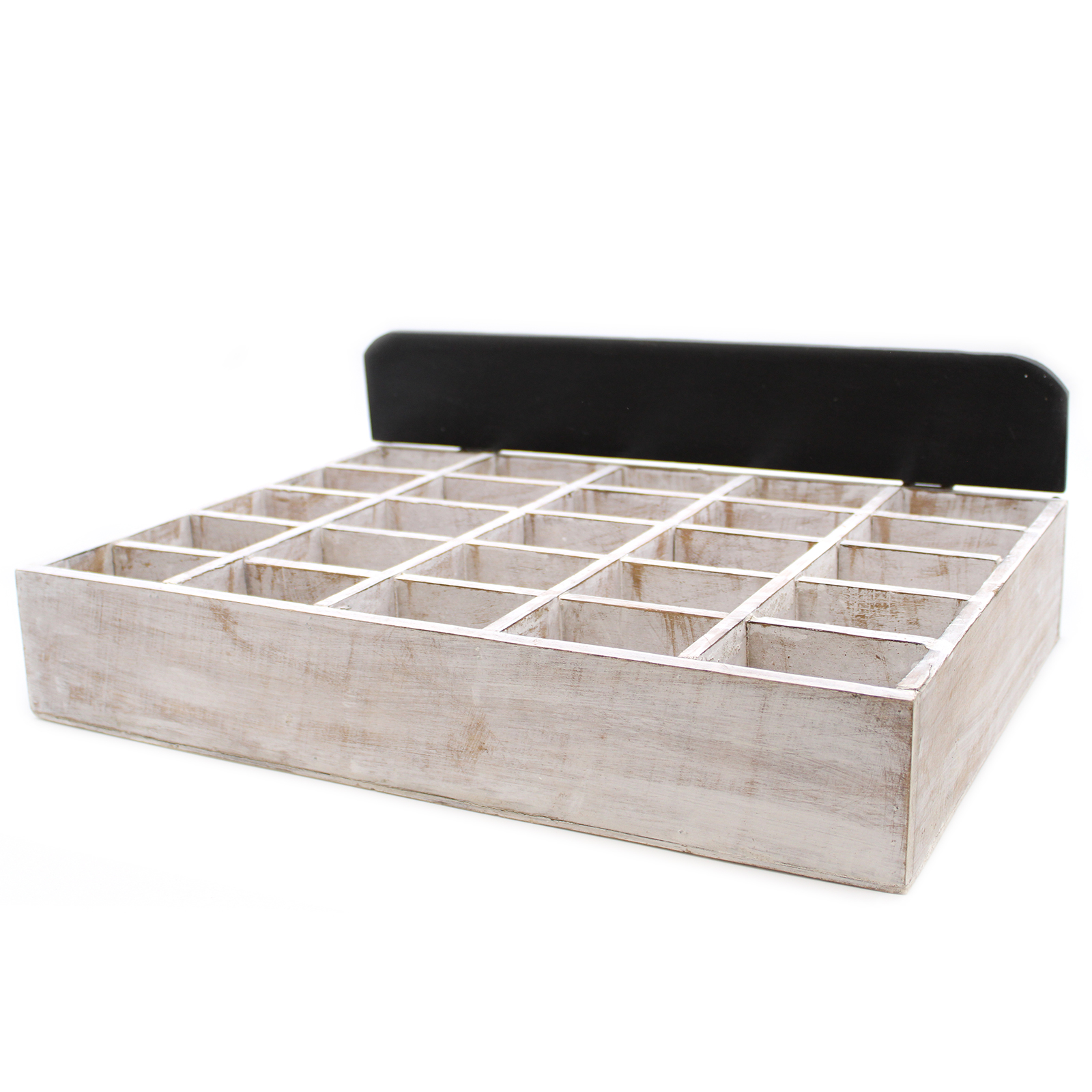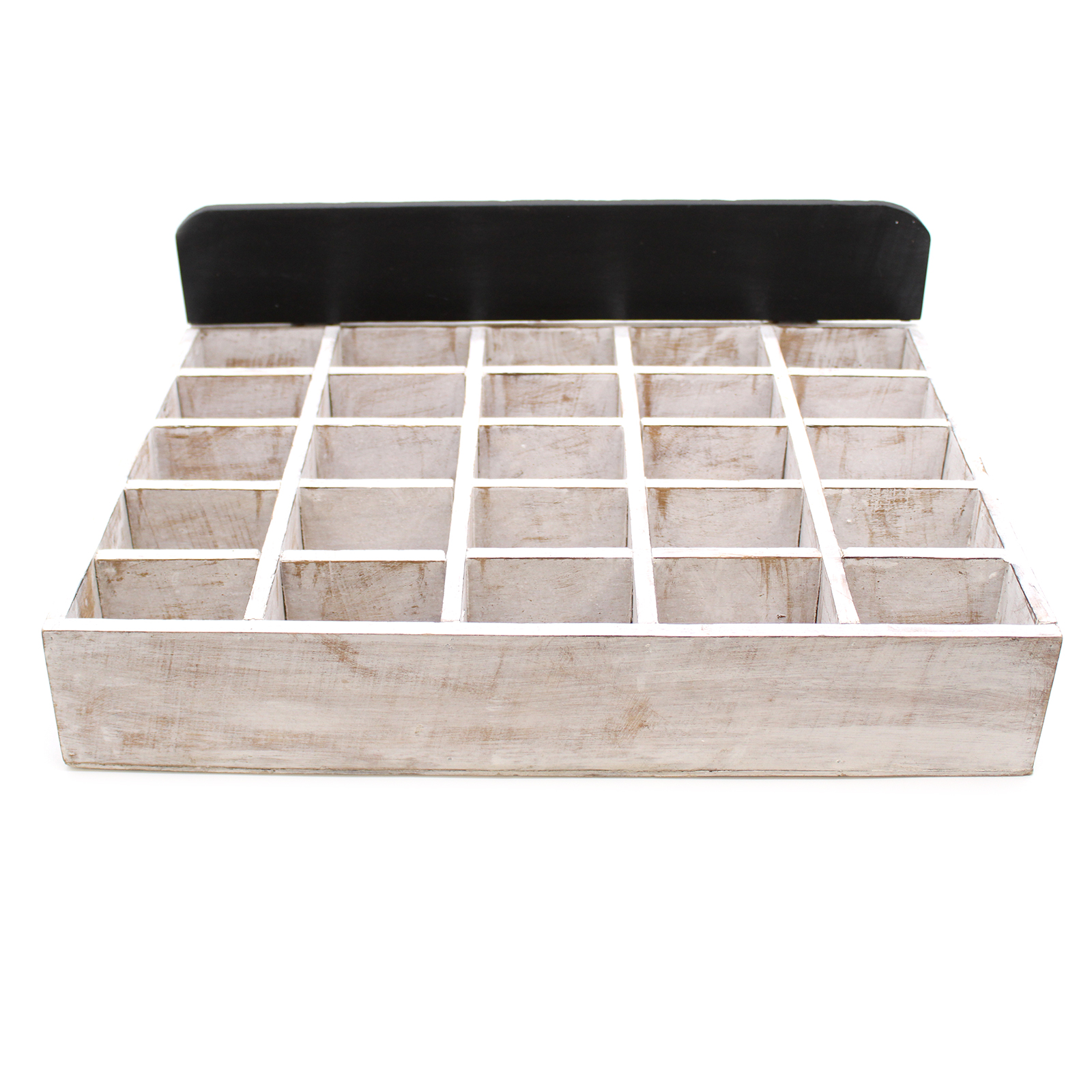 Die 25 Tabletts bestehen vollständig aus weiß getünchtem Albesia-Holz, einem leichten und langlebigen Holz. Perfekt, um es mit fertigen Produkten zu transportieren, ins Auto zu laden und direkt auf den Markt zu bringen. Dieses praktische Präsentationstablett verfügt außerdem über einen faltbaren Tafelkopf. Stellen Sie sich eine Schachtel voller bunter Gästeseifen in Blumenform vor, Sie würden die Aufmerksamkeit Ihrer Kunden auf sich ziehen