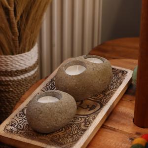 Verleihen Sie Ihrem Sortiment mit diesen handgefertigten Flussstein-Kerzenhaltern aus Indonesien einen Hauch von Natur.