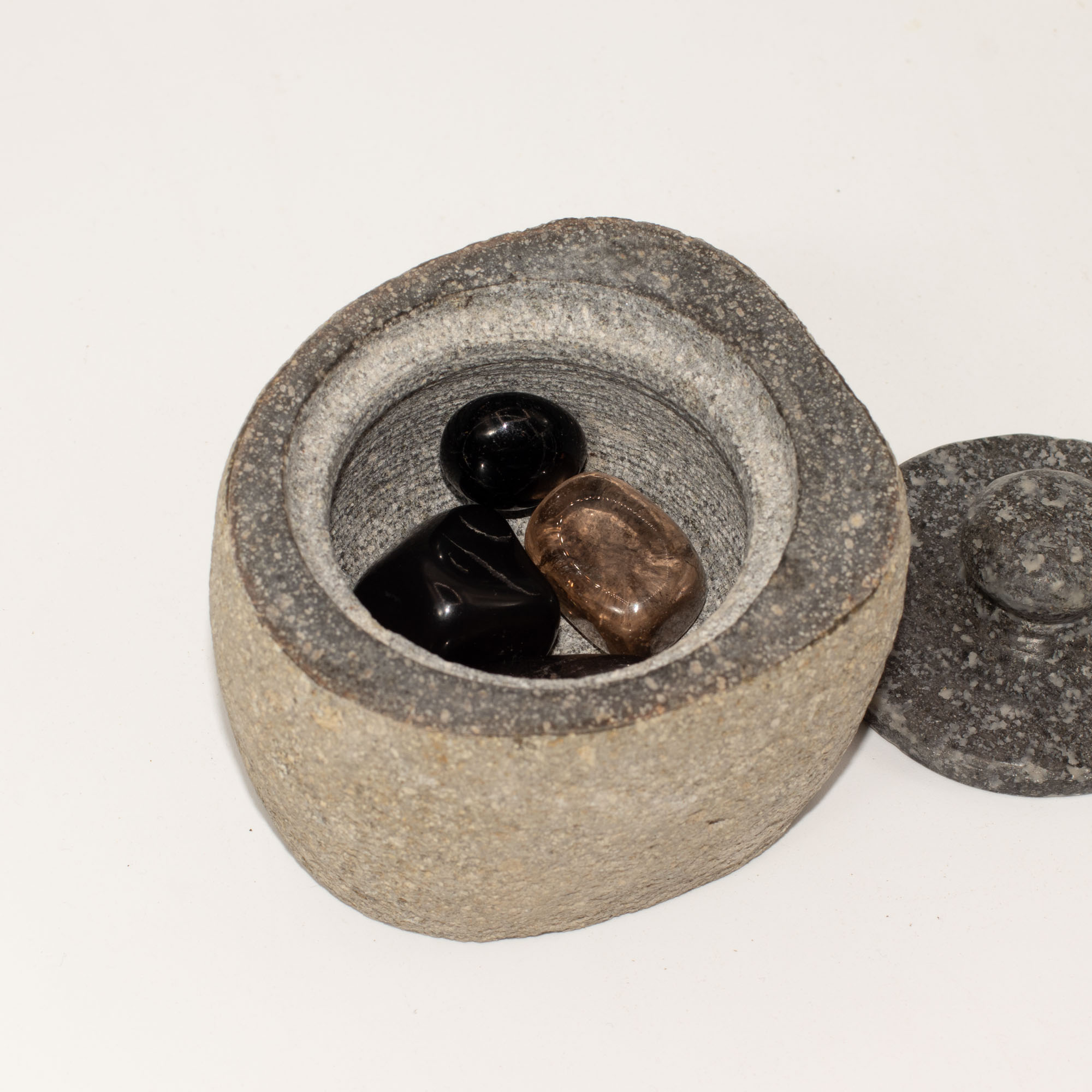 Gefüllt mit dunklen, erdenden Edelsteinen dient er als einfacher Fokuspunkt für Ruhe, Reflexion oder alltägliches Gleichgewicht. Ideal für Schreibtische, Nachttische oder Regale, vermittelt er ein subtil stabiles Gefühl, ohne übertrieben spirituell zu wirken.