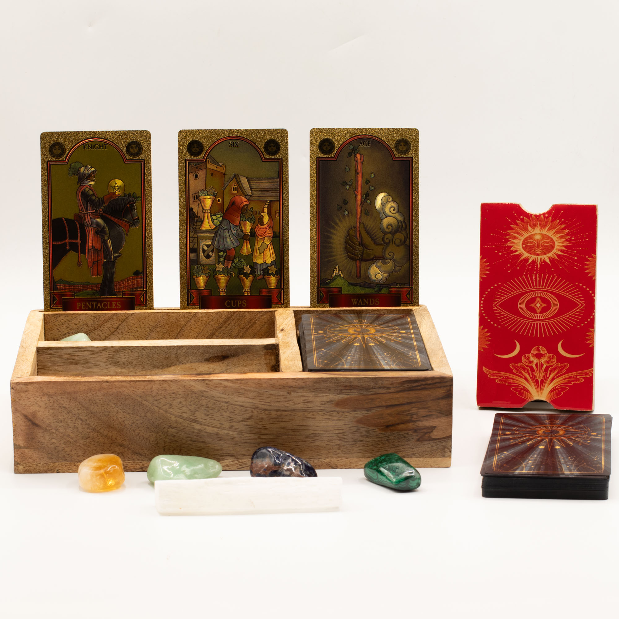 Für umfangreichere Legungen konzipiert, bietet diese Tarotbox aus Mangoholz drei Innenfächer, die eine strukturierte und vielseitige Aufbewahrung der Karten ermöglichen. Das unterteilte Layout erlaubt es, Decks, Legemuster oder Referenzkarten ordentlich zu organisieren, während der integrierte vordere Kartenhalter einen klaren Blickfang für eine gewählte Karte während Legungen oder im Verkaufsdisplay bietet.