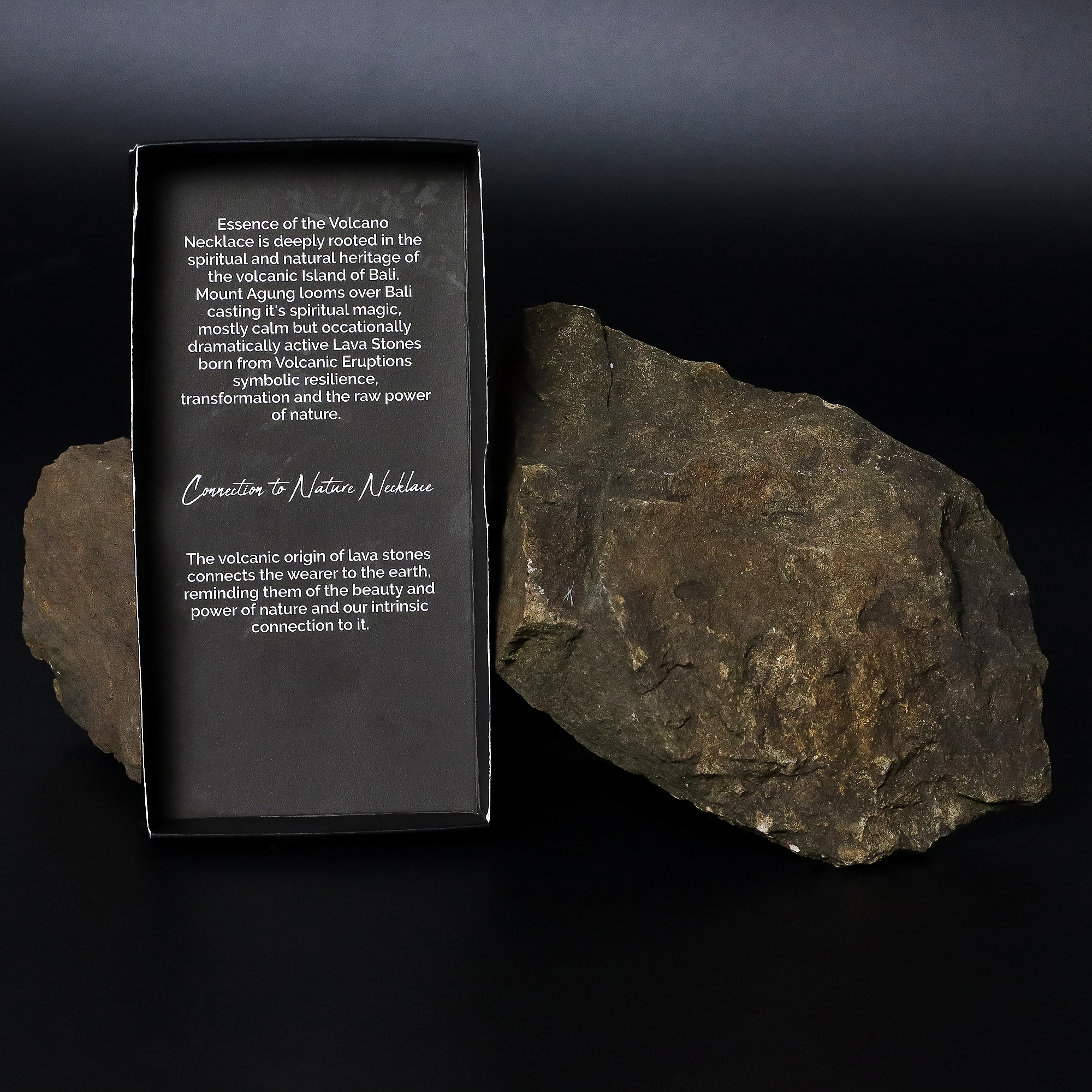 Die „Connection to Nature“-Halskette soll den Träger in die kraftvolle, elementare Energie der Vulkanlandschaft Balis eintauchen lassen. Jede Perle aus echtem Lavagestein verkörpert den Geist der Erde und erinnert an unsere tiefe Verbundenheit mit der Natur und ihre transformative Kraft. Die natürliche Textur der Lavaperlen verleiht ihnen einen kräftigen, erdigen Charakter, der sich in jedem Schmuckstück wunderbar präsentiert.