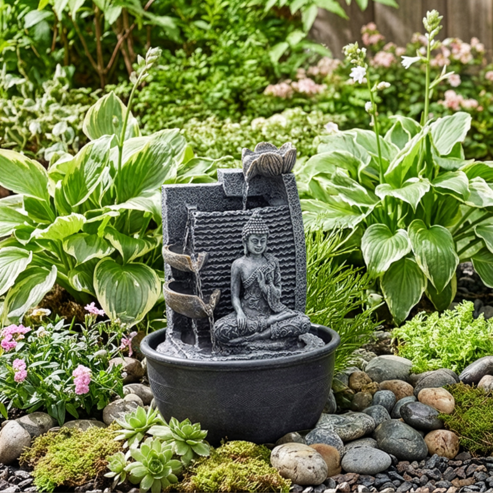Die Lotusblume, seit jeher mit Reinheit, Erneuerung und spirituellem Wachstum verbunden, ergänzt die Buddha-Figur, Symbol für Weisheit, Ruhe und Erleuchtung. Gemeinsam bilden sie einen bedeutungsvollen Blickfang, der durch die sanfte Bewegung des fließenden Wassers Entspannung, Besinnung und positive Energie fördert.